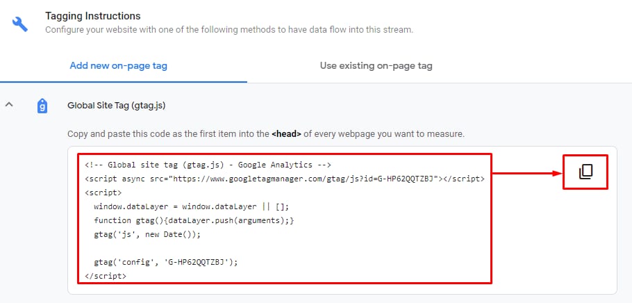 5. Now the last step is to insert this Global Site Tag code into the <head> of every page on your website.