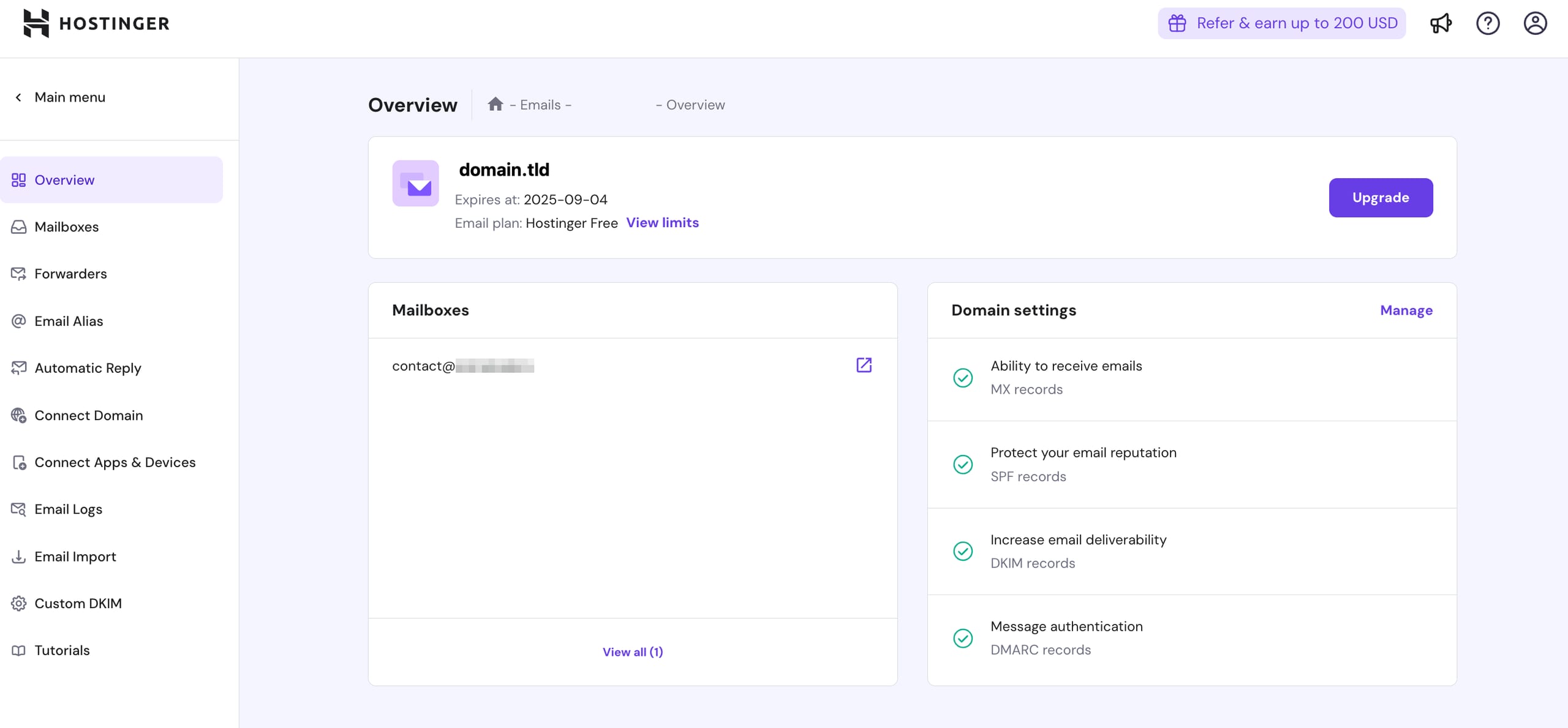 When managing your email services at Hostinger, you’ll find everything you need in the Email section of your hPanel. Here’s a quick guide on what you can access and manage there.