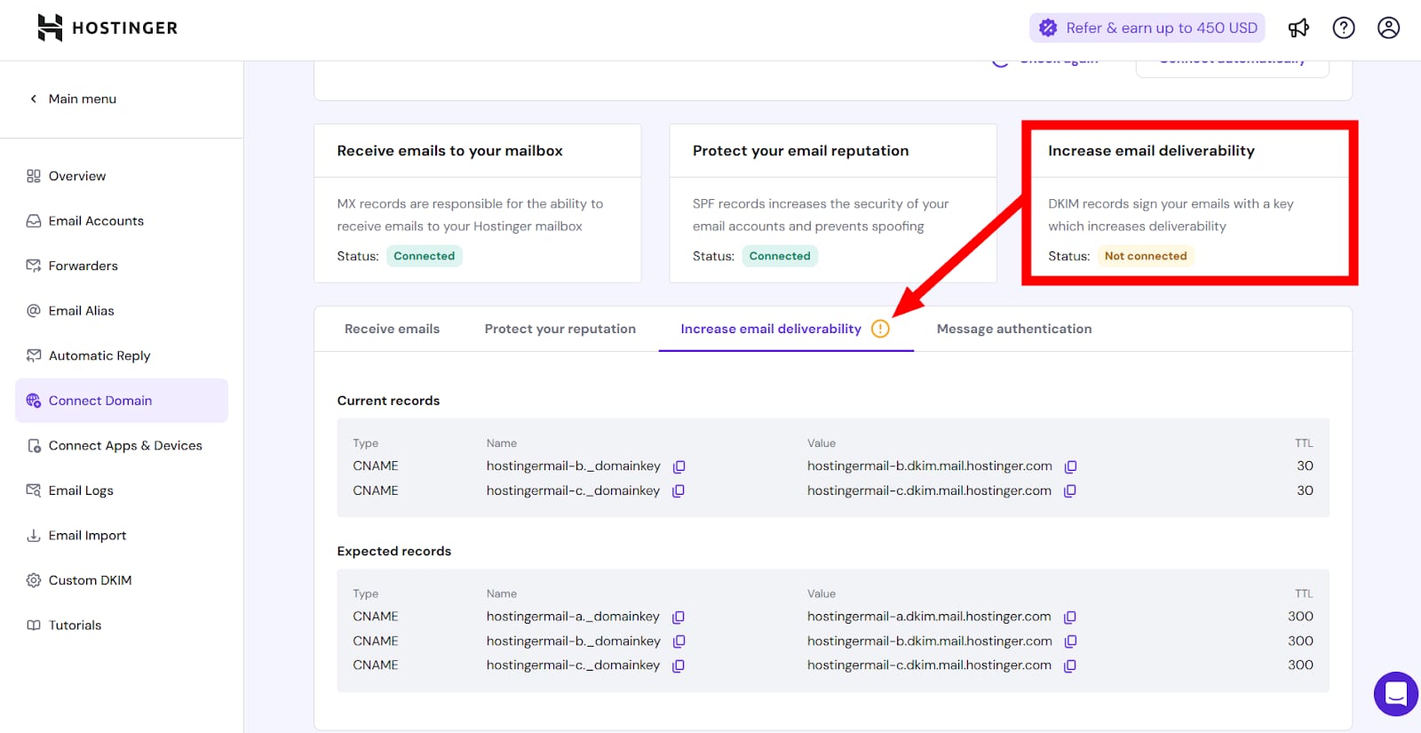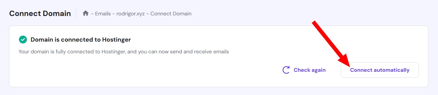 If your domain uses Hostinger’s nameservers and you are using Hostinger Email, you can fix DNS issues automatically by clicking Connect automatically.