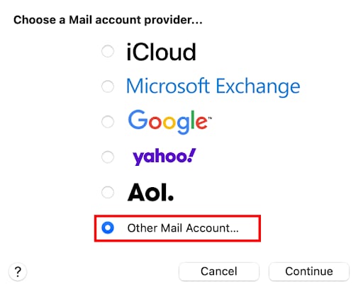 3. Select Other Mail Account and click Continue.