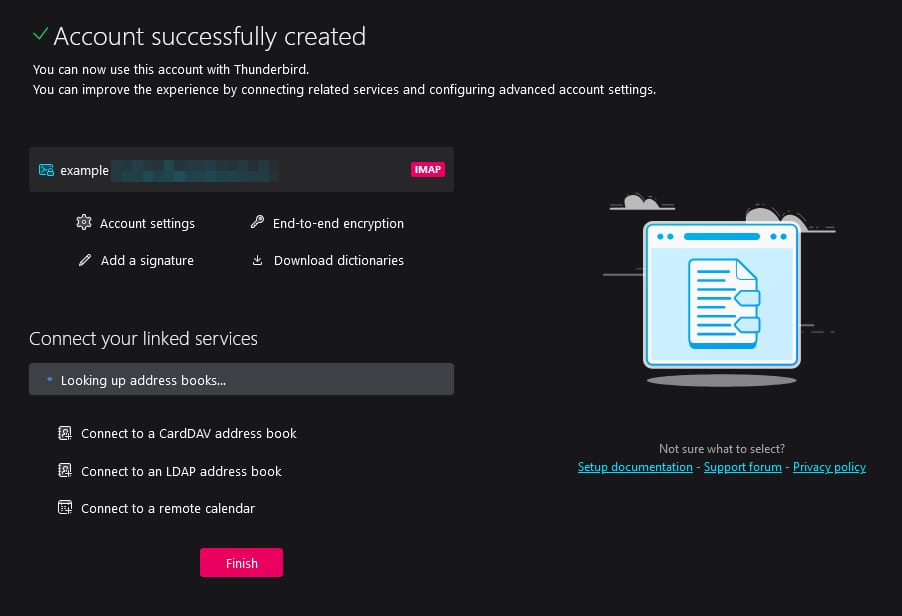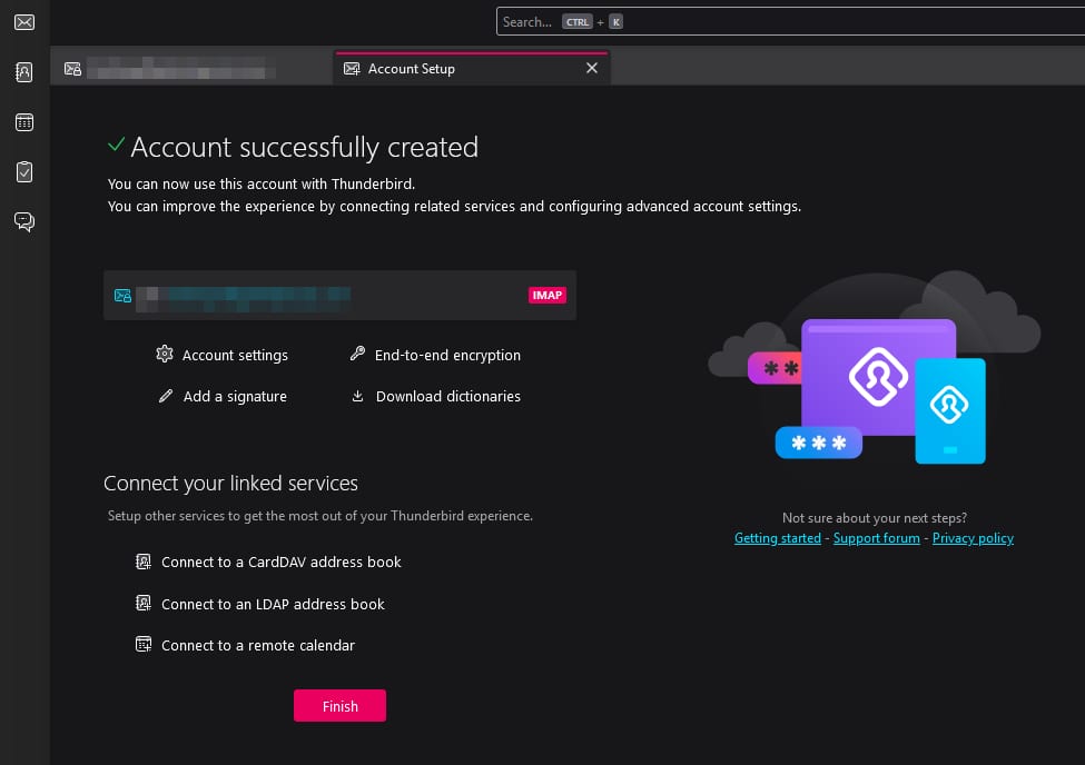 Once Thunderbird confirms everything is correct, click Done and then Finish.