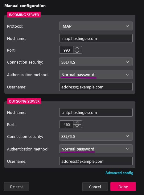 To set up Hostinger Email on Mozilla Thunderbird manually, make sure that: