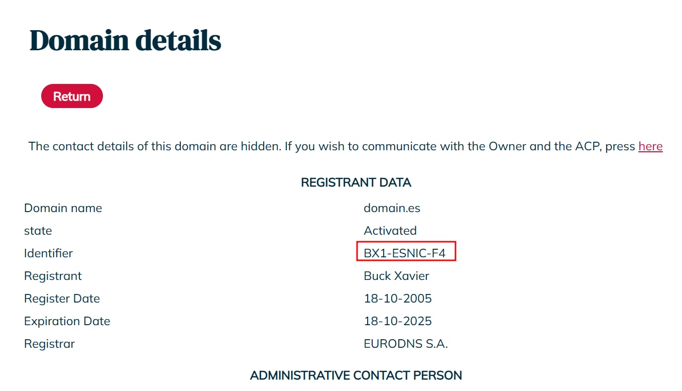 After a successful trade, the registrant information will be updated in Dominio.es and the Registrant Data Identifier reflects the new ESNIC handle: