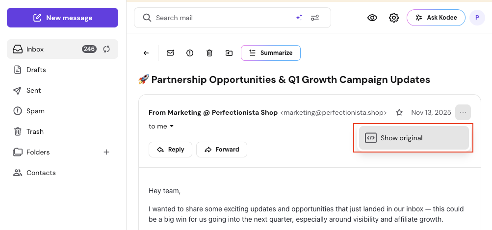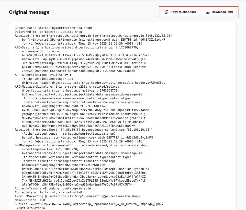 This guide shows you how to open the email source and view email headers in Hostinger Mail, including how to copy them or download the full .eml file.