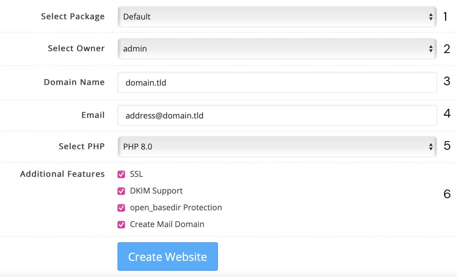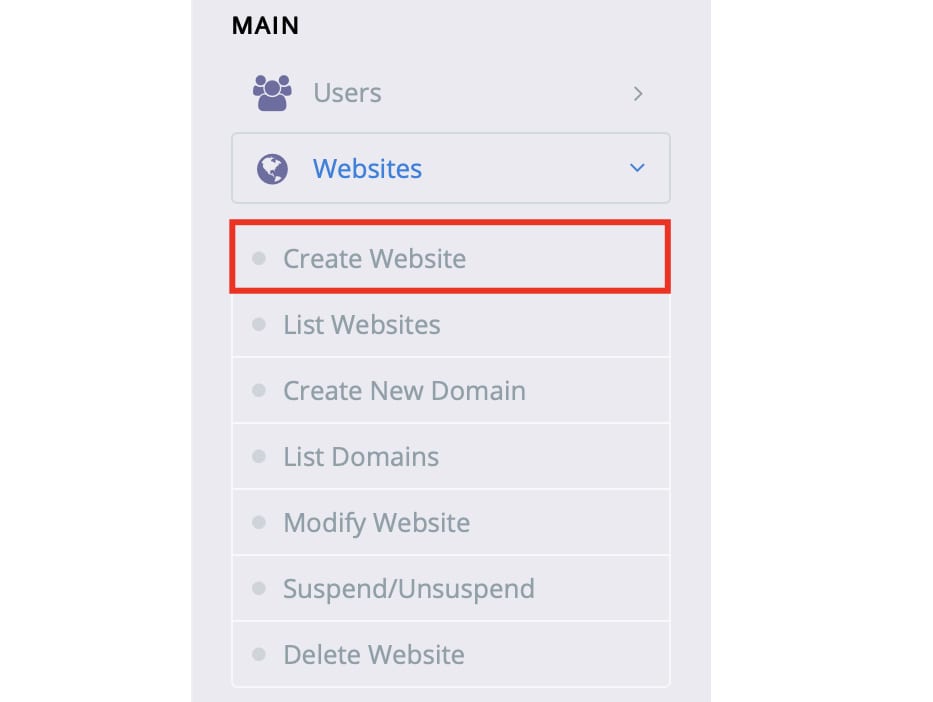 On the left side of the control panel, choose Websites → Create Website: