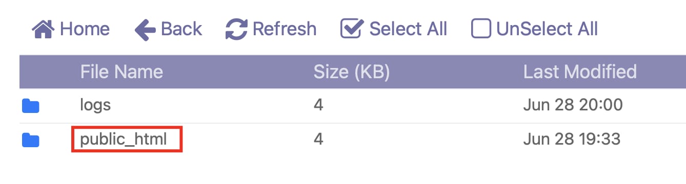 Inside the File Manager, access the public_html folder (it’s a root folder of your domain. If you want files to be uploaded to a custom folder, open it):