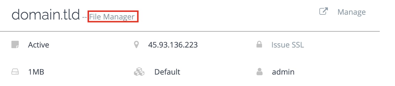 In CyberPanel click on Websites → List Website → File Manager next to the desired website: