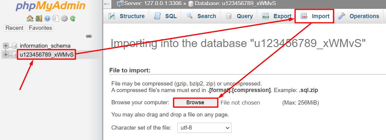 There, just click on the database name in the left column, choose Import, and select your database file (in .sql or .sql.zip format).