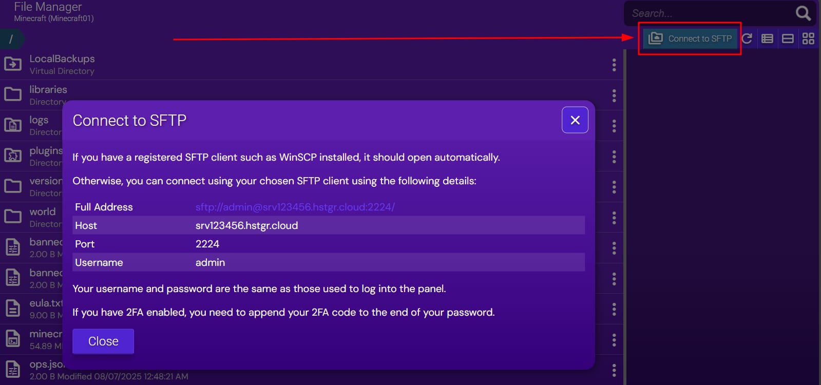 If you are using Game Panel, you can connect to your files via an FTP client such as FileZilla. Details for the FTP connection can be found by clicking on the Connect to SFTP button: