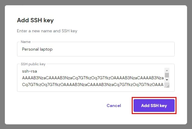 Insert the name by which your SSH key will be saved, the public key itself, and click on Add SSH key: