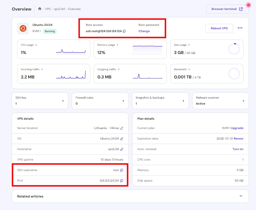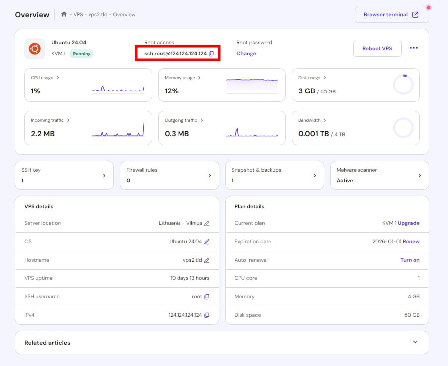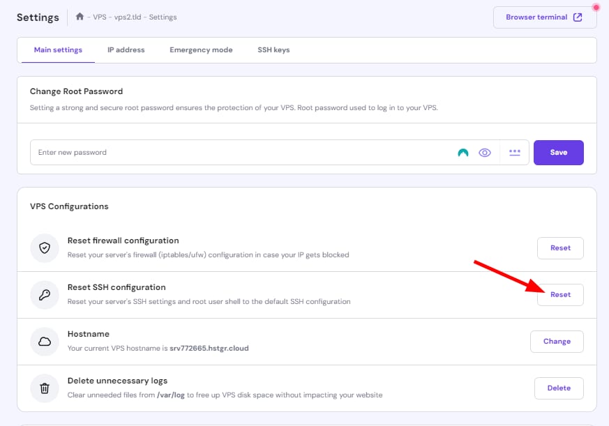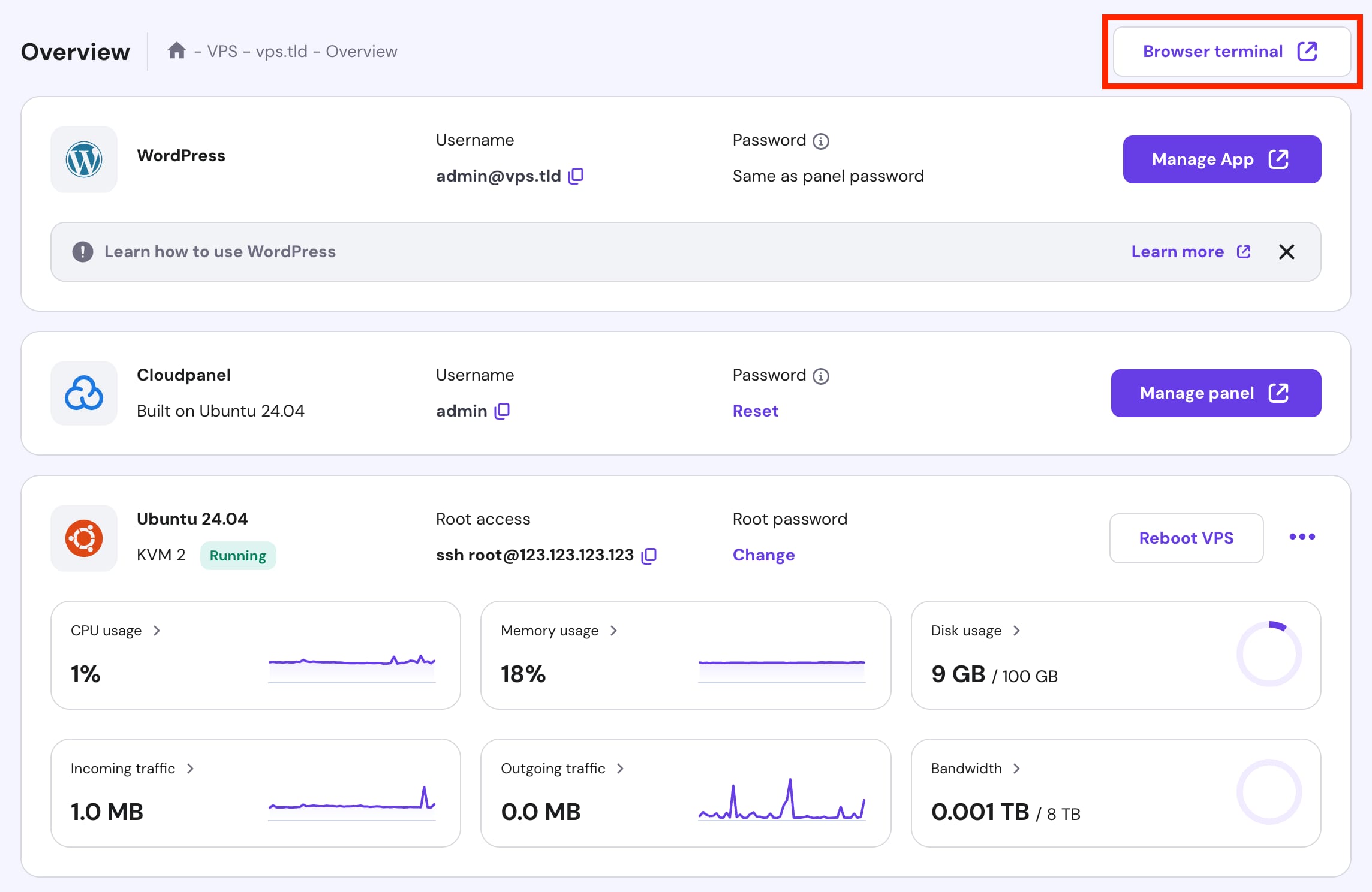 Go to your VPS Overview page. In the top right corner, you will see “Browser terminal”. Press this button to access your VPS SSH.