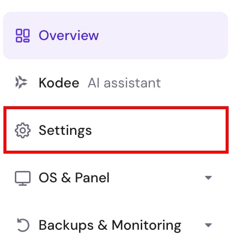 To enable it, navigate to the VPS section of your hPanel and click on Manage next to your chosen server. Next, open the Settings page:
