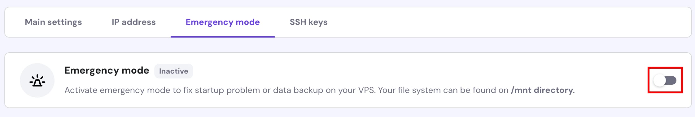 Sometimes, a malware infection or an accidental system file deletion can deem your VPS unusable. In case restoring a backup is not an option, you can access your VPS using the Emergency mode as a last resort option to retrieve your data from a corrupted or broken VPS.