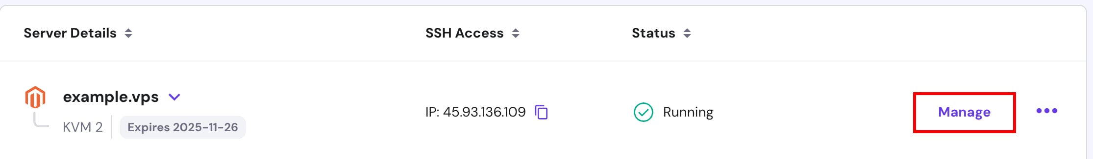 While not recommended, you can still use your own DNS resolvers by navigating to the VPS section and choosing Manage next to your chosen server: