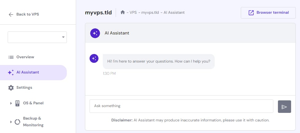 Ask the integrated AI consultant your VPS related questions, it will help you the best it can!