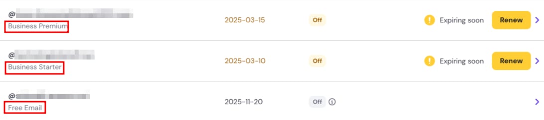 And check the details below the Plan Name. If Hostinger Email is free, it will be listed as ‘Free Email.’ For paid Hostinger Email plans, it will show either ‘Business Starter‘ or ‘Business Premium.