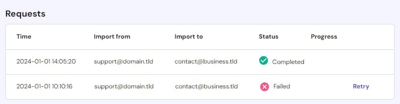 That’s it! You may find all the requests and their statuses in the Requests section of the Import Email tool: