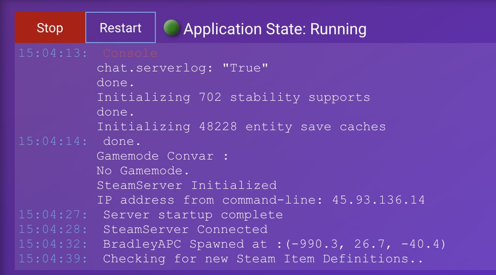 Now click Start once again, and it will start your first Rust Server! These messages below (can be seen in the console) means that your server is up and running, and you can now connect to it: