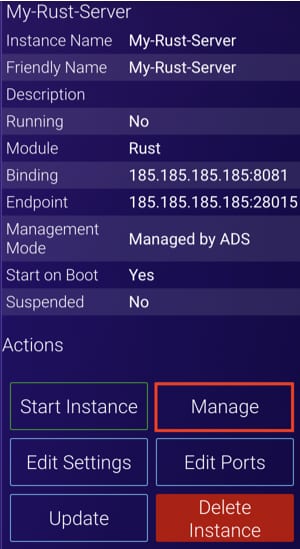 Now, click on the instance and choose the Manage option on the right side menu: