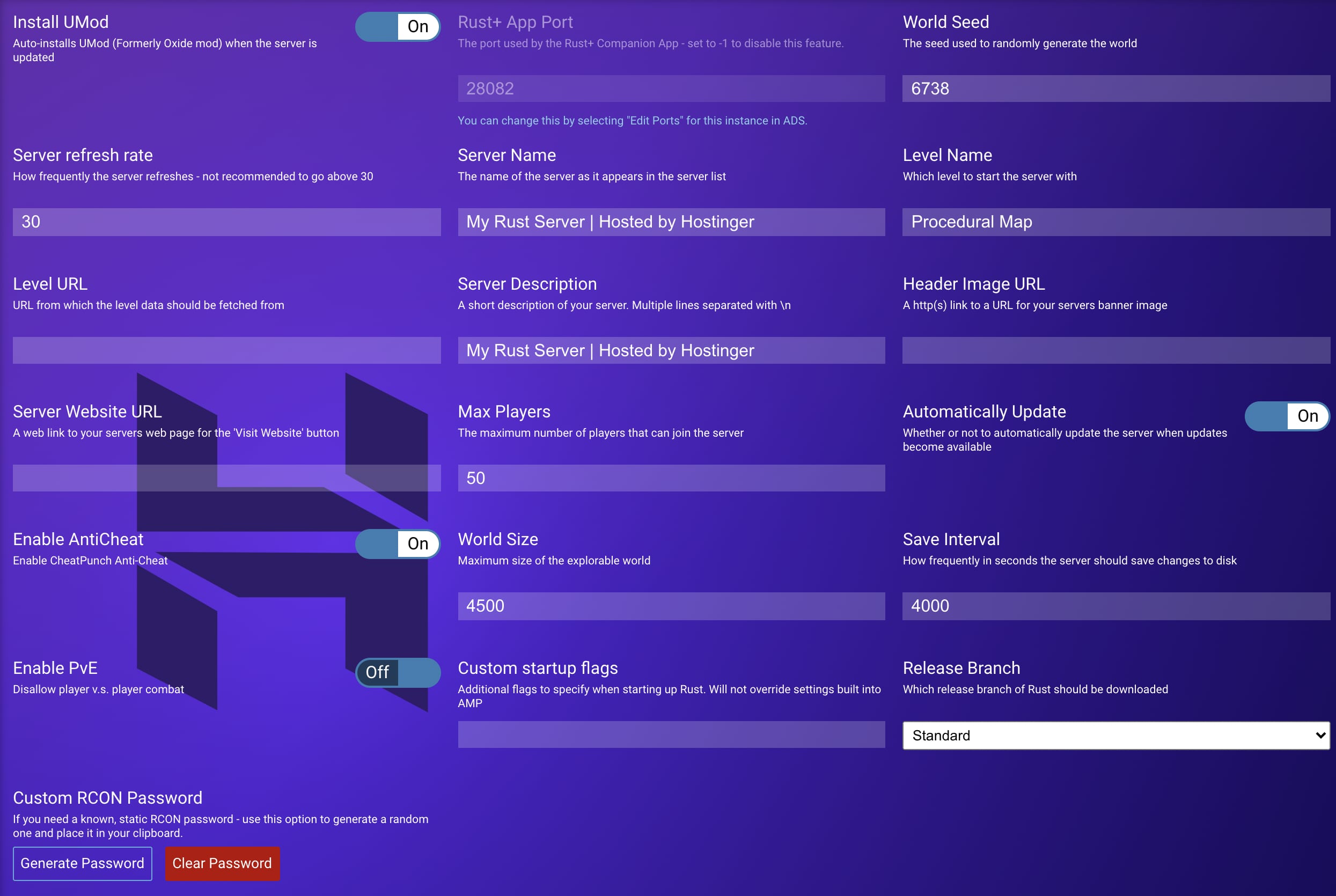 Head to Configuration > Rust. There, you’ll be able to change the name of your server, map, install Umod (formally Oxide, used for installing plugins and mods), enable or disable PVE, etc. Simply change the options according to your liking.