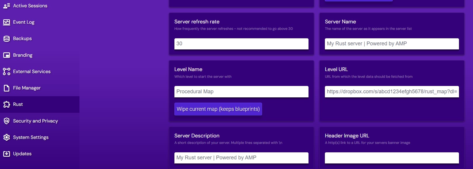 Once you have done this, go to the Rust configuration page. There, you will find all the settings for your Rust server. There, find a level URL field. In this field, you have to insert a direct download link, which your server will use to download the map: