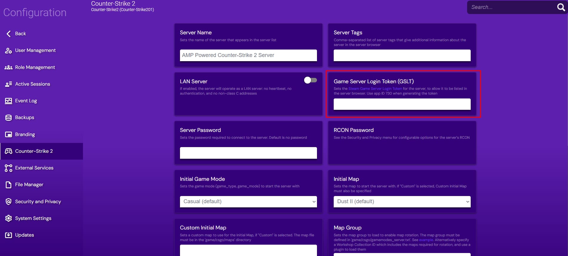 5. For the game setup options, go to Configuration → CS2 Server Settings and paste your generated Game Server Login Token (GSLT):