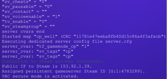 Now click Start once again, and it will start your first Team Fortress 2 Server! These messages below (can be seen in the console) means that your server is up and running, and you can now connect to it: