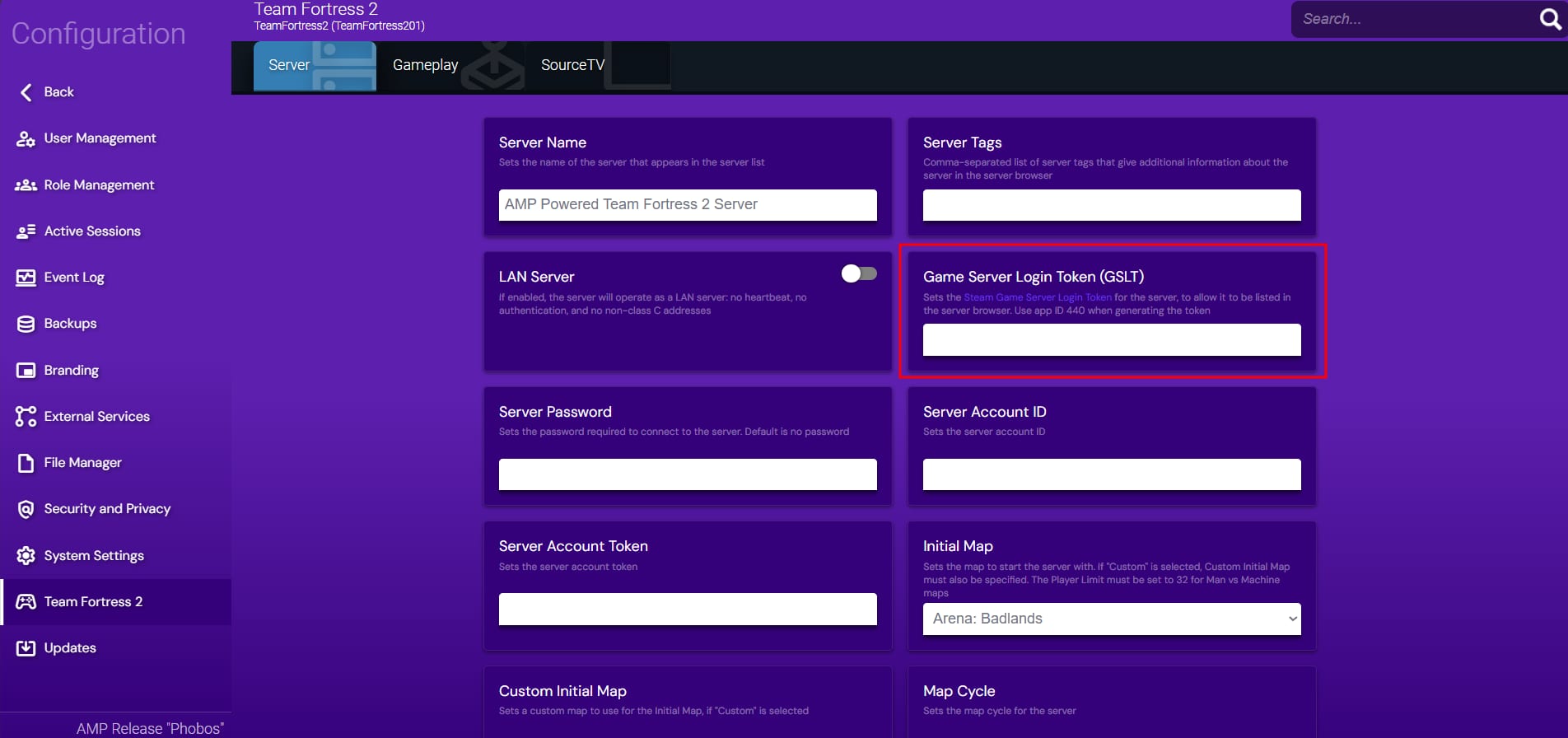 Head to Configuration > Team Fortress 2 Server Settings. There, you’ll be able to change the name of your server, map, add server password, enable or disable VAC Anticheat, change game modes. Simply change the options according to your liking. The important thing you need to do here is, paste your generated GSLT token: