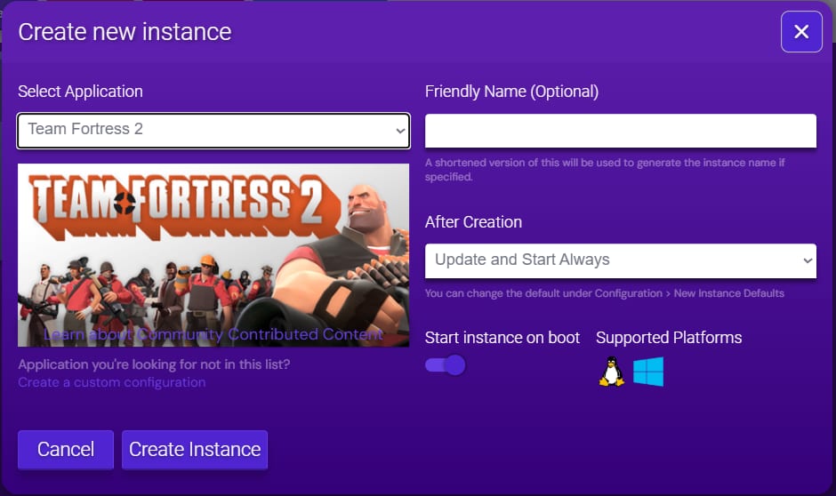 Once you log in to the Game Panel, you’ll have no instances. In this case, simply click on Create Instance and choose Team Fortress 2 from the dropdown list. If you did everything correctly, the instance creation pop-up should look like this:
