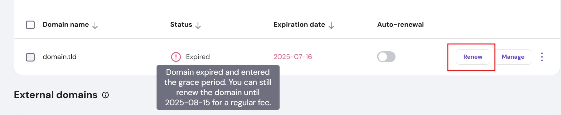 Some TLDs do not have a grace period and go straight to redemption after expiration. For this reason, we recommend enabling auto-renewal 💡