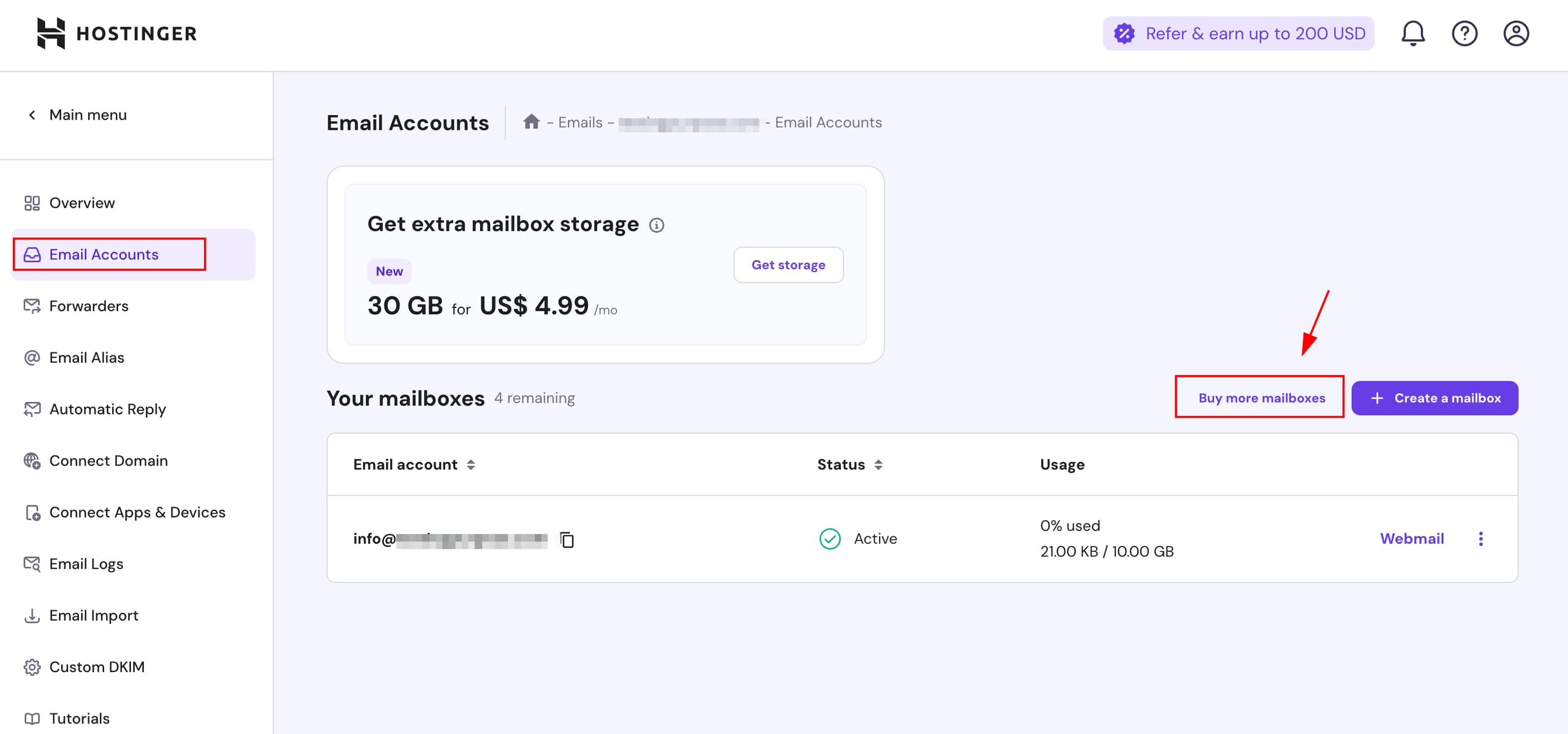 Click on Email Accounts and then Buy more mailboxes