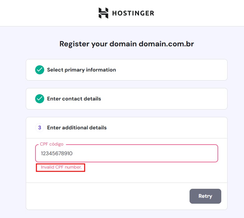 If you are registering a .br domain (including .com.br, .org.br, etc.) and get an “Invalid CPF Number” message: