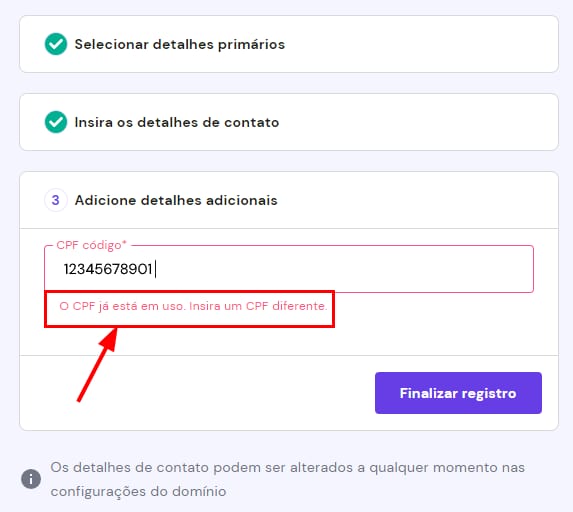 This means that the CPF entered has already been previously used. For security reasons, each CPF/CNPJ can only be associated with one Hostinger account. To solve this, you need to register the domain with a different CPF or CNPJ.