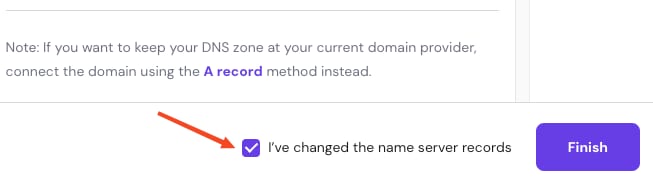 On the page with the nameserver names, mark the checkbox to confirm the changes, then click on the Finish button to return to hPanel: