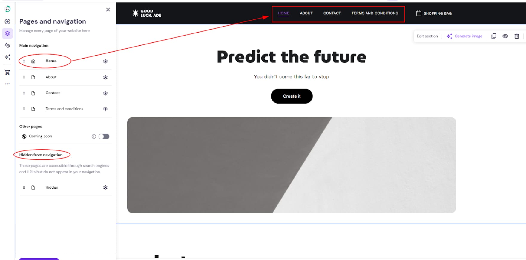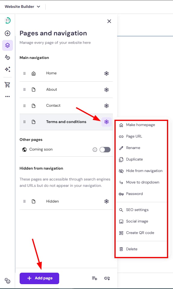 * Pages hidden from the navigation menu remain publicly accessible via their URLs and appear in search engines; you can hide pages from search engines in the SEO settings