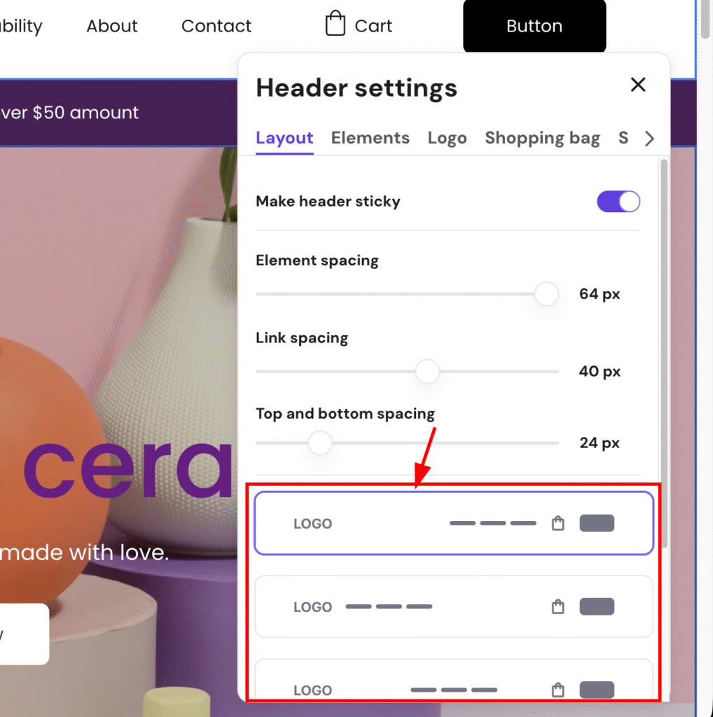 The logo is visible in the website’s navigation menu, also called the header section, which is the topmost section of your website. If you can’t see the header section, it’s likely that all your website pages are hidden from the navigation menu.