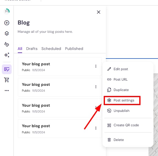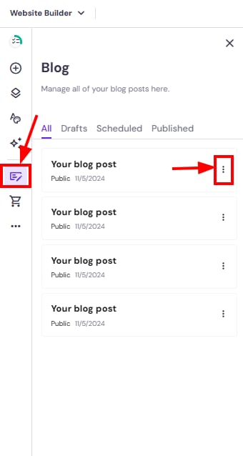 Within the builder, open the blog management panel on the left. Find the blog post you want to edit, and click on the ellipsis button ⋮ next to its title: