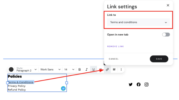 - Add a text element to your footer and insert the titles of your policy pages (e.g., Privacy Policy) there.