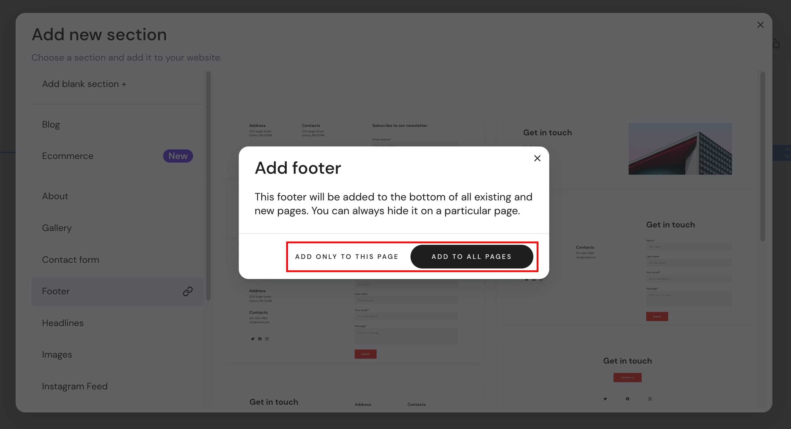 It’s recommended to select the Add to all pages option. This way, the footer is pinned to the bottom of your website, and you can hide it from particular pages manually. Otherwise, if you select Add only to this page, the footer will be inserted below the selected section. You may need to move the footer to the very bottom manually: