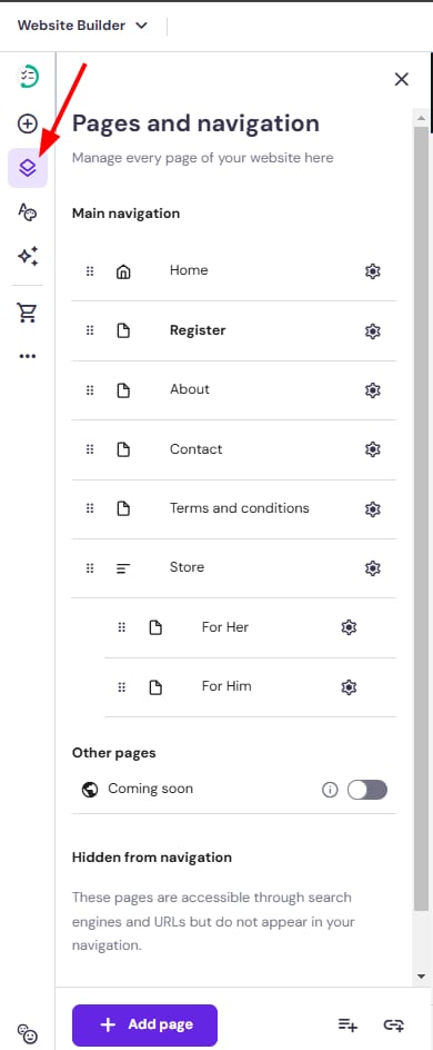 Within the website builder, you’ll find all your pages in the Pages and navigation panel on the left: