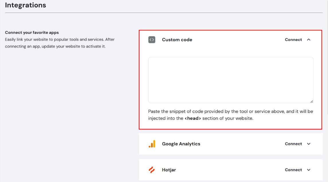 Within Hostinger Website Builder, access the integrations settings and find the Custom code field. Insert your Google AdSense code there: