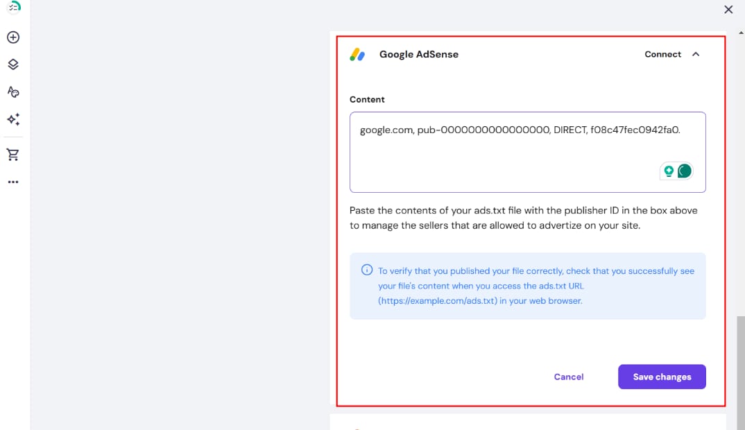 Once you create the file, open your website’s integrations settings and paste the file into the Google AdSense field: