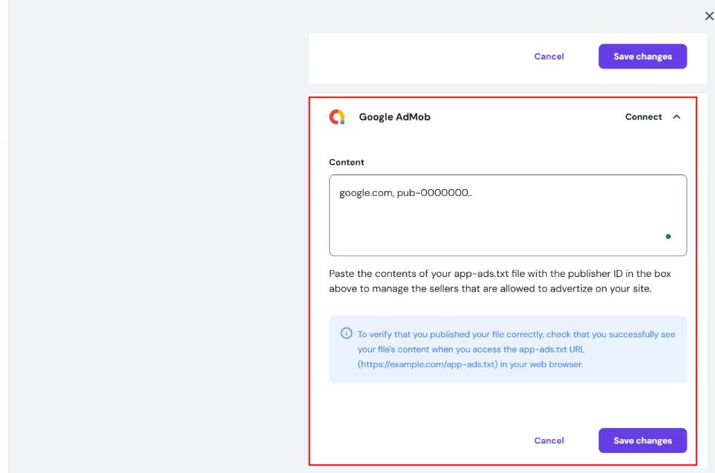 3. Then, open your website’s integrations settings, find the Google AdMob field, and paste the code there: