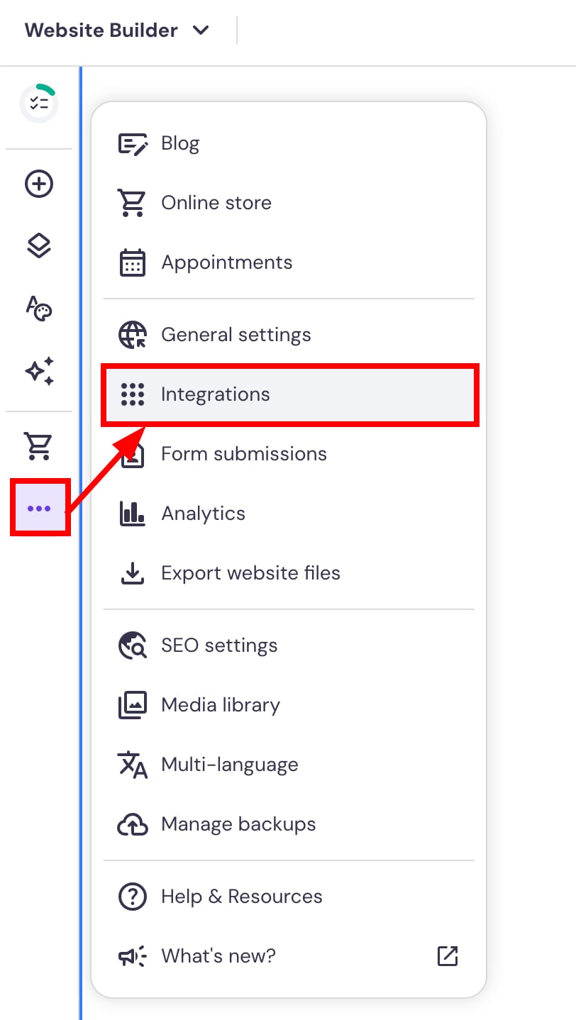 Within the builder, click on the ellipsis button (⋯) to open website settings and select Integrations: