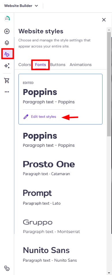 1. Within the editor, expand the Styles panel on the left and open the Text tab. Choose the preferred pair of fonts from the suggested ones, or customize them by clicking on the Edit text styles button: