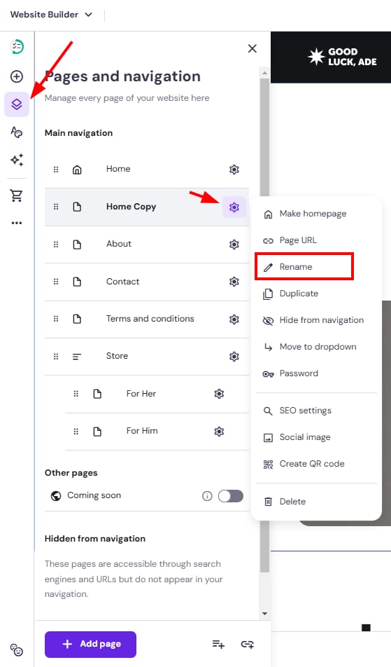 In Hostinger Website Builder, you can easily rename the pages of your site.