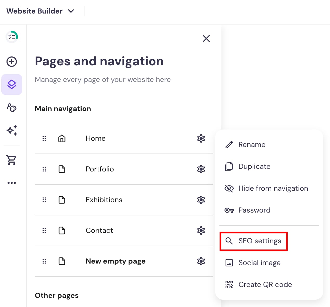 Within the builder, expand the Pages and navigation panel on the left, click on the page settings, and select SEO settings: