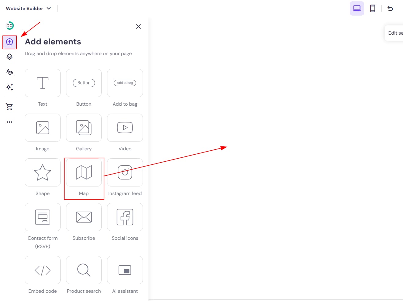 Within the editor, open the Add elements panel on the left. Choose the Map element and drag it to the preferred place on your website: