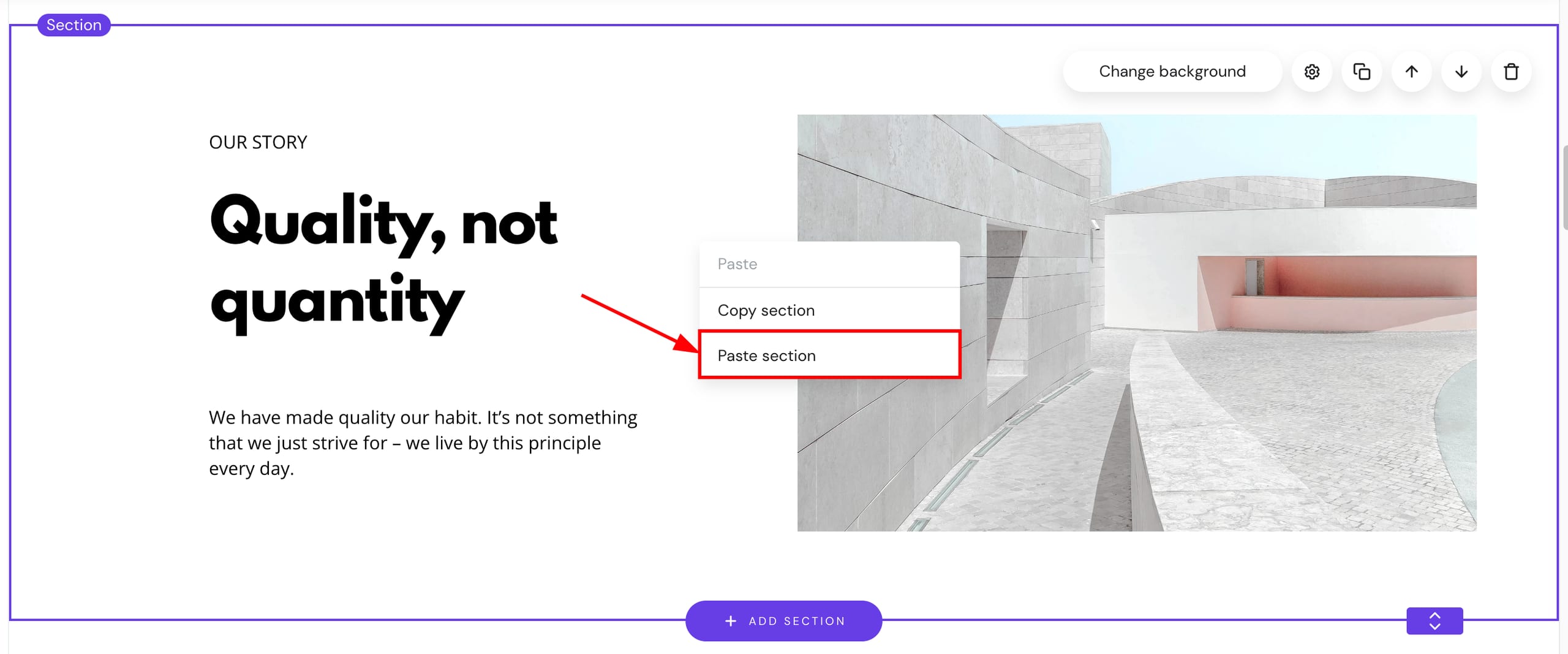 To paste a section, right-click on an empty space of a section and select Paste section: