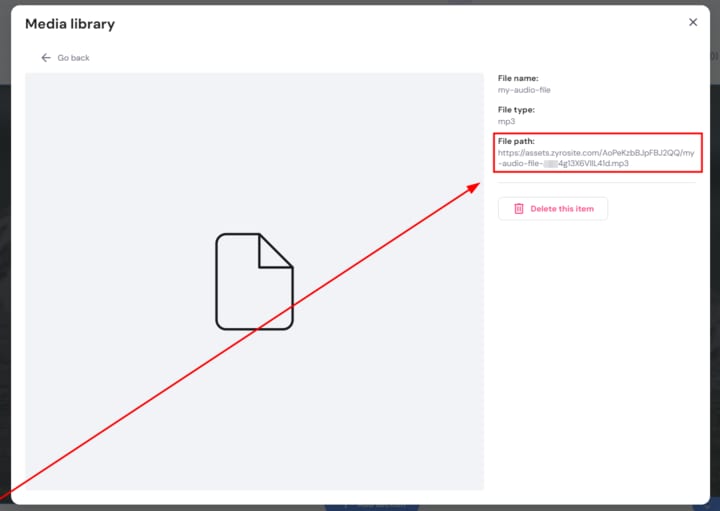Go back to the Embed Code element that you previously created, then paste the URL of your audio file there, like this: